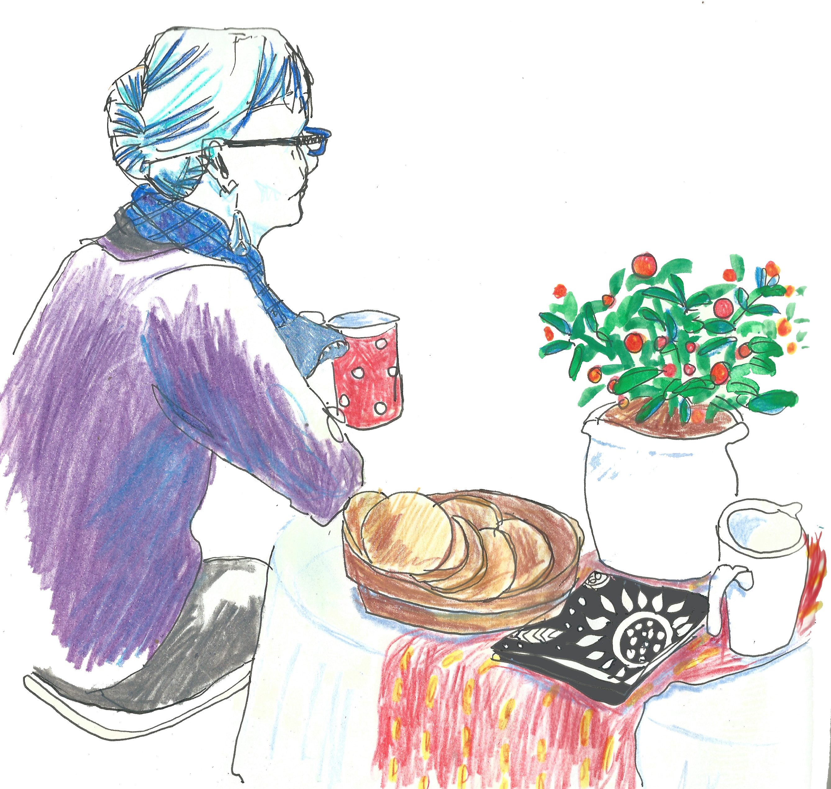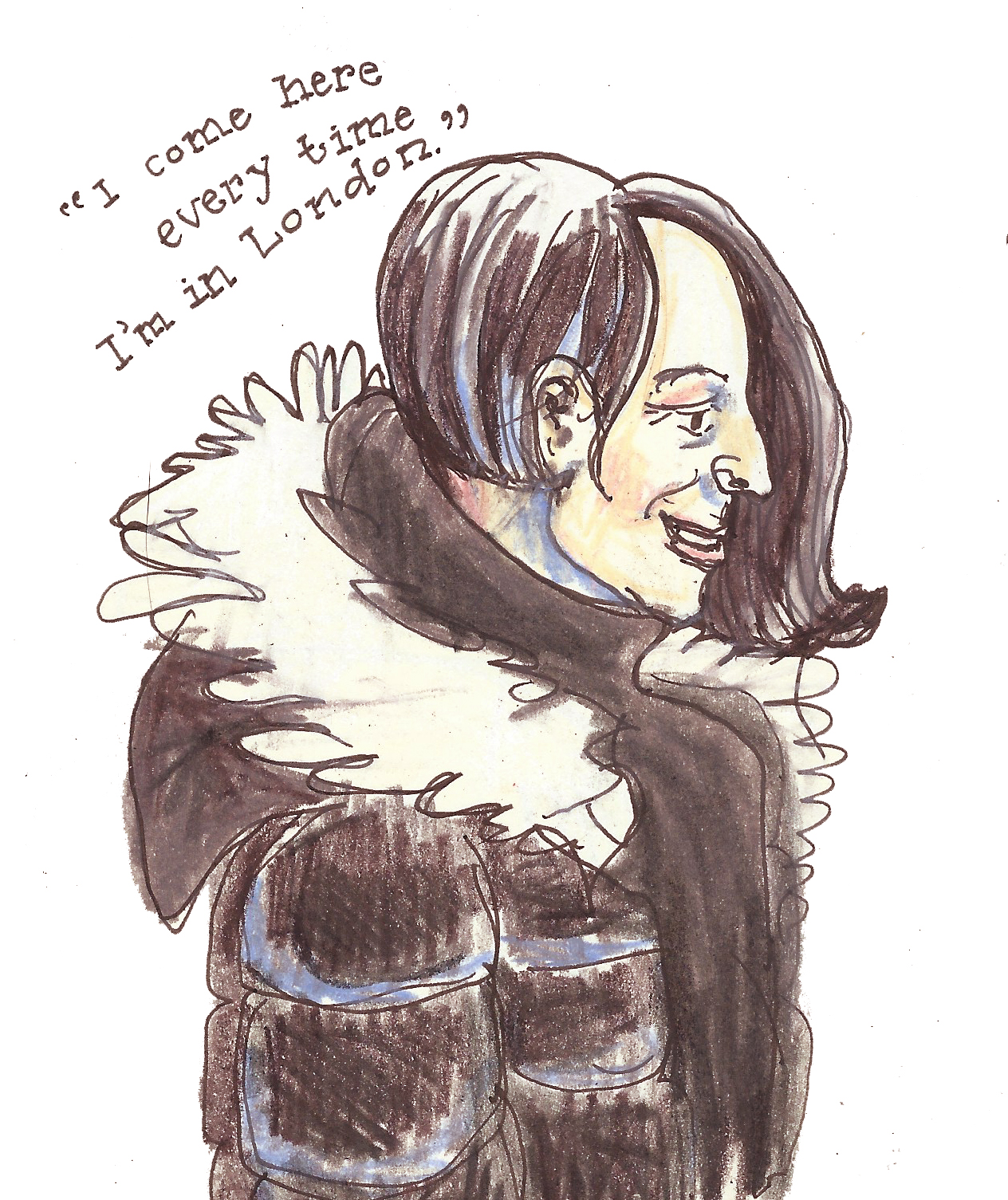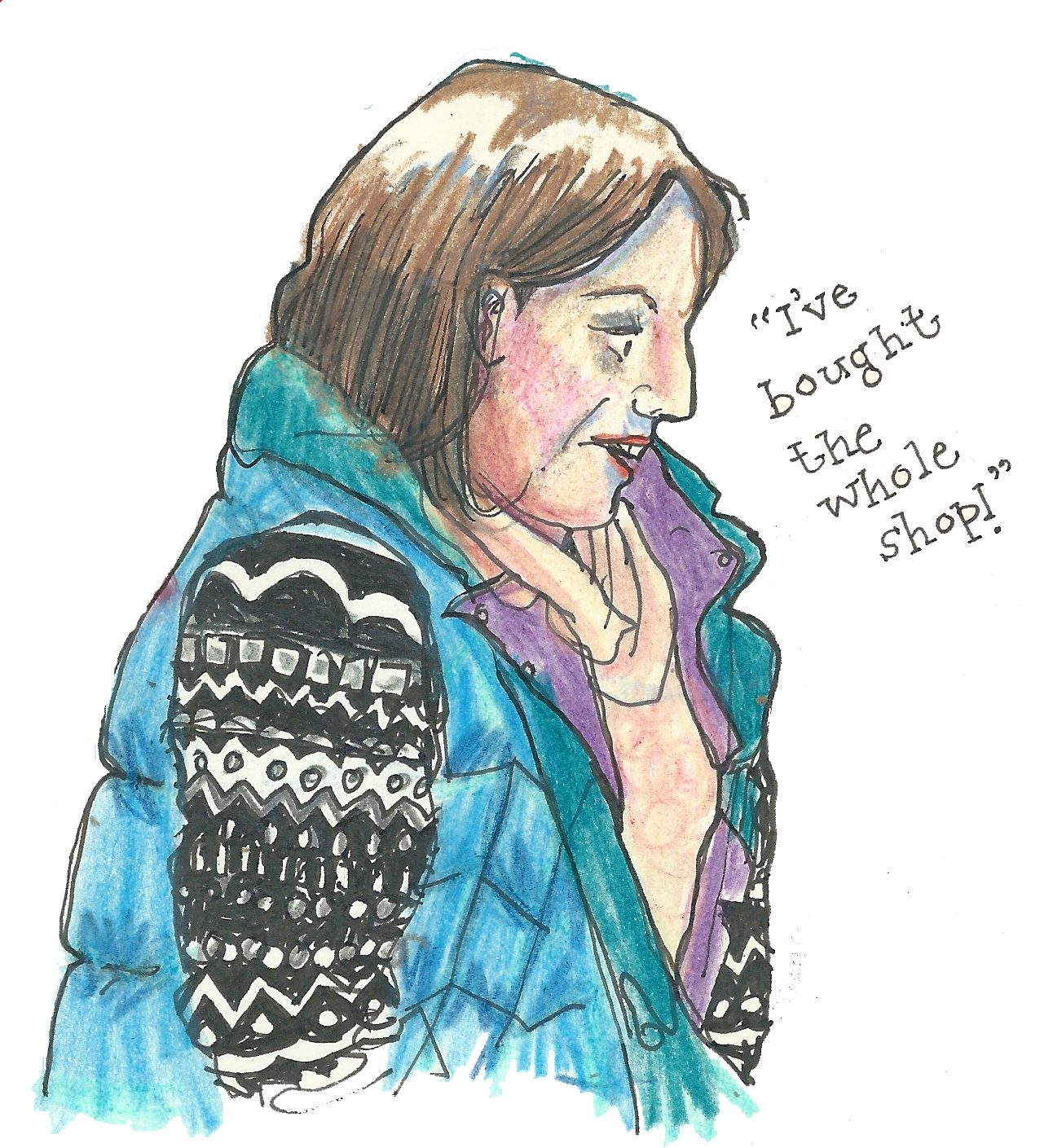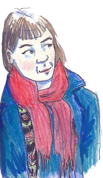 Drawing people as they quickly came to say hello was difficult, so I have not tried for exact likenesses. In most cases, I was drawing and colouring in long after the customer had departed, so colours and details are often from memory, or completely made up. Please don’t feel offended if you see an unflattering rendition of yourself – chances are I’ve mixed you in with one or two other people! Likewise, I’ve mixed and matched the things I heard people saying to Gudrun, so they probably aren’t next to the people who actually said them.