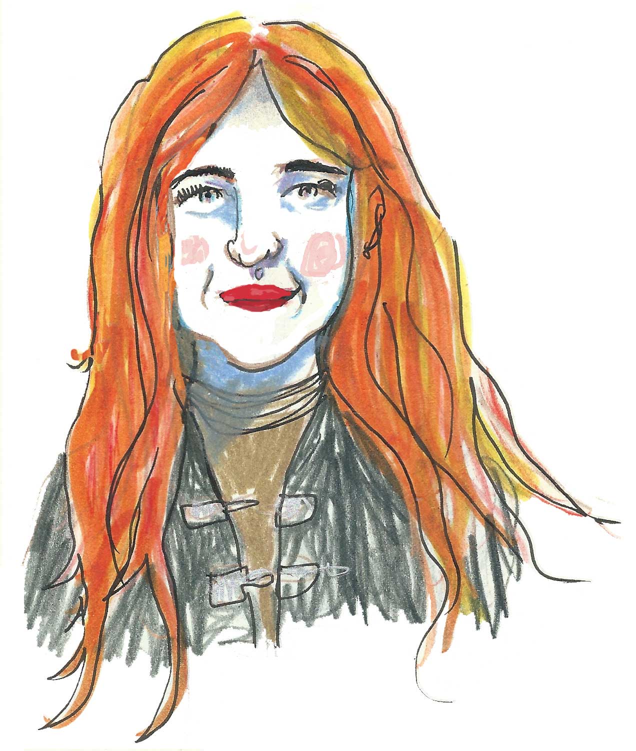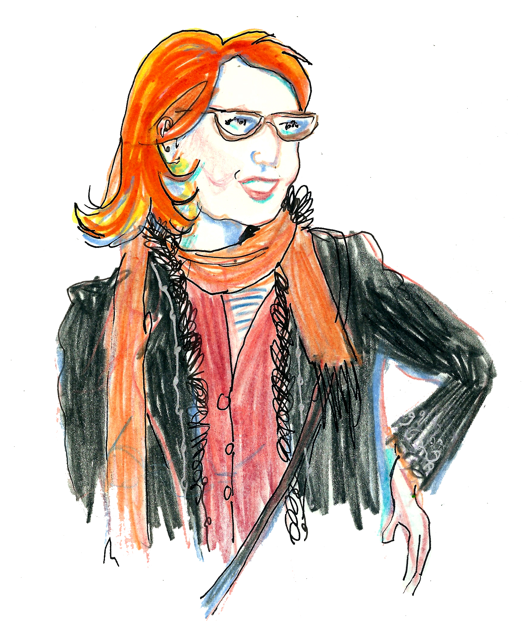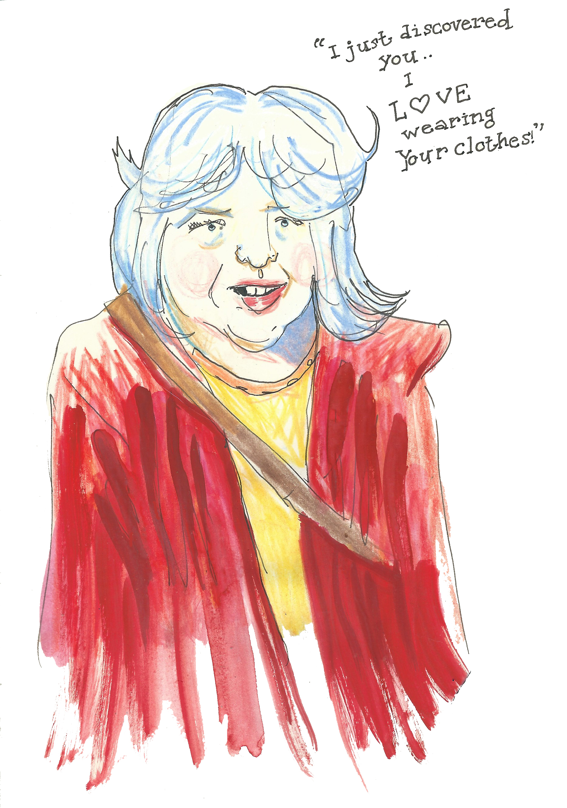 Drawing people as they quickly came to say hello was difficult, so I have not tried for exact likenesses. In most cases, I was drawing and colouring in long after the customer had departed, so colours and details are often from memory, or completely made up. Please don’t feel offended if you see an unflattering rendition of yourself – chances are I’ve mixed you in with one or two other people! Likewise, I’ve mixed and matched the things I heard people saying to Gudrun, so they probably aren’t next to the people who actually said them.