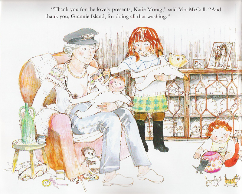 I was shocked to hear that some libraries actually banned the books for depiction of breastfeeding (?!) but it’s also really heartening that an illustrator can make her own quiet difference by standing ground over such issues. There are actually quite a few breastfeeding images across all the Katie Morag books, as part of the busy jumble of the family’s everyday life.