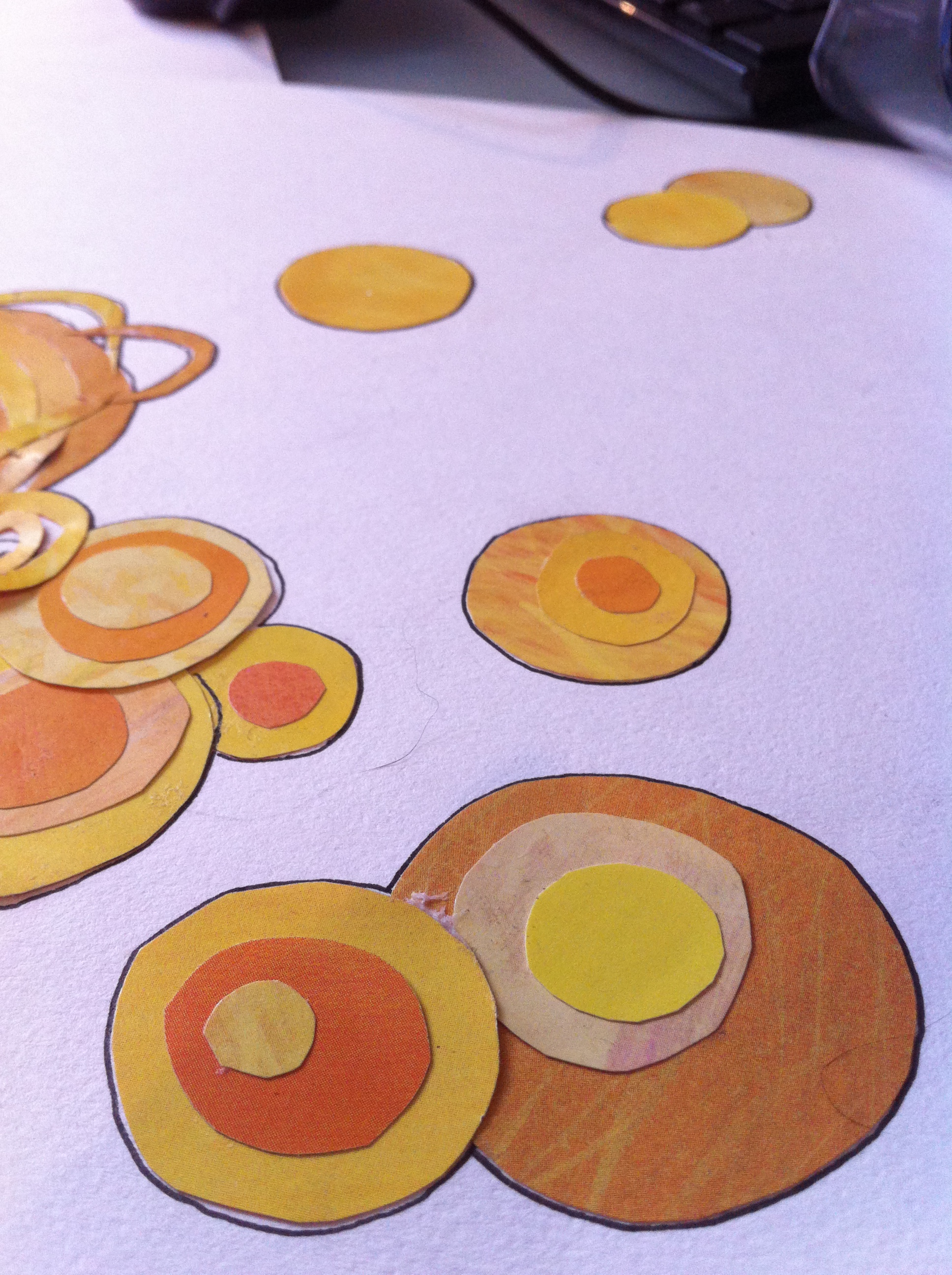 This is where collage is great. While I wouldn’t especially like to paint six different options for approval, it’s so easy to cut out some different shapes and arrange them on the page to show what they’d look like.