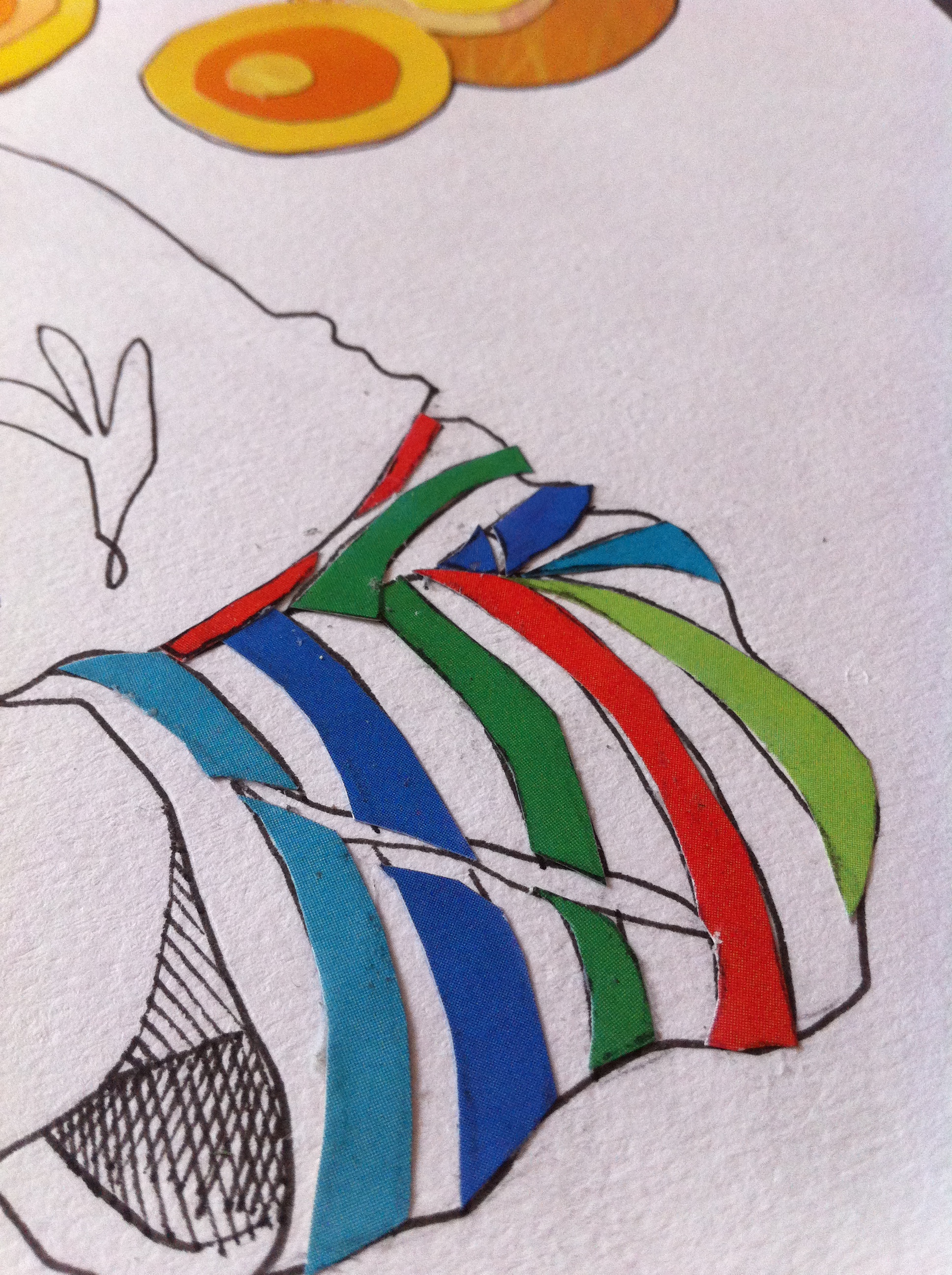 Leo’s mum liked the collages I’d been putting up on this blog, and she wondered if I could do something similar for this commission. After a little thought I came up with an idea that she liked the sound of: a line drawing with collaged highlights.