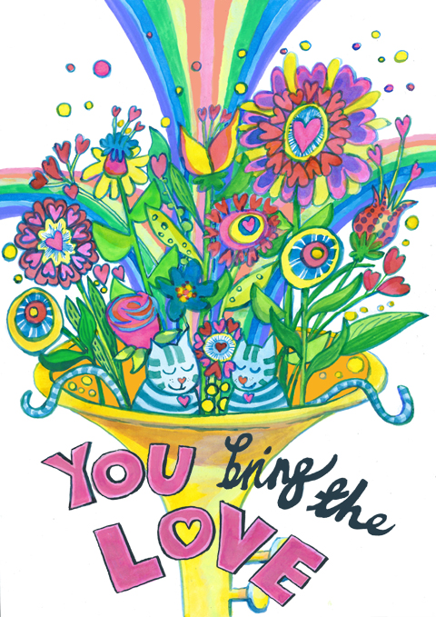 In advance of Valentine’s Day, here is some exuberant blossoming of flowers, cats and rainbows. In bright colours. Not like cynical old me at all… :)