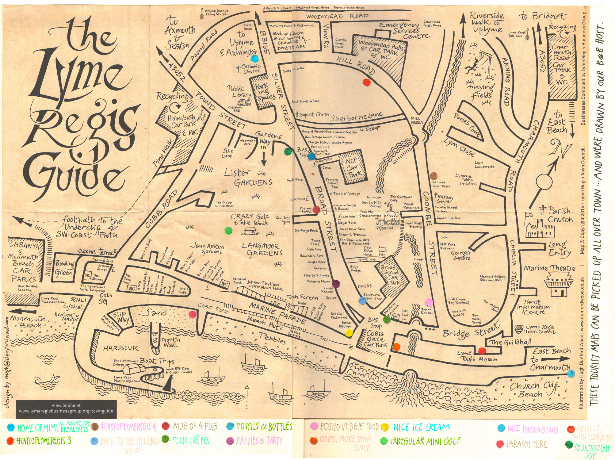 This map (below) was available free, all over the town, for tourists to pick up — and it was drawn by Hugh, our B&B proprietor. Taking a proper look at it, it’s clear that there is still plenty to do in Lyme Regis, so we will have to return.
