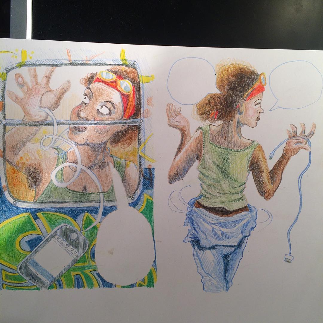 If you follow me on Instagram itself, you’ll have seen some of the drawing process and, far more challenging, the cutting, sticking, unsticking and resticking that ensued when it dawned on me that a comic about Instagram could only really have one format: it needed to be a vertical scroll. Cue lots of rough print-outs and mock copies in various configurations.