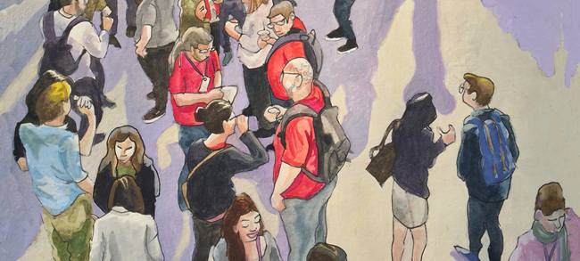 I was away so I couldn’t make the opening night, but here’s a picture from Myriad publishing’s Corinne, featuring many of the exhibitors (click to see it at a larger size):