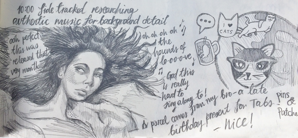 10:00 Sidetracked researching authentic music for background detail. Ooh perfect, this was released that very month. Oh-oh-oh the Hounds of Love – God, this is really hard to sing along to! A parcel comes from my bro – a late birthday present for Tabs… pins and patches – nice!