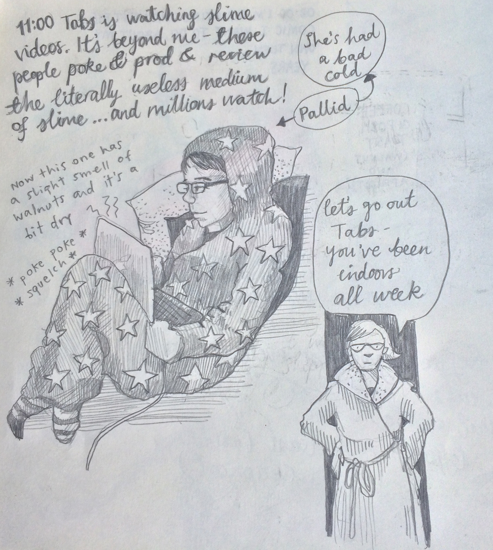 11:00 Tabs is watching slime videos. It’s beyond me – these people poke and prod and review the literally useless medium of slime.. and millions watch! ‘Now this one has a slight smell of walnuts and it’s a bit dry’ *poke poke* *squelch* Let’s go out Tabs, you’ve been indoors all week (she’s had a bad cold).