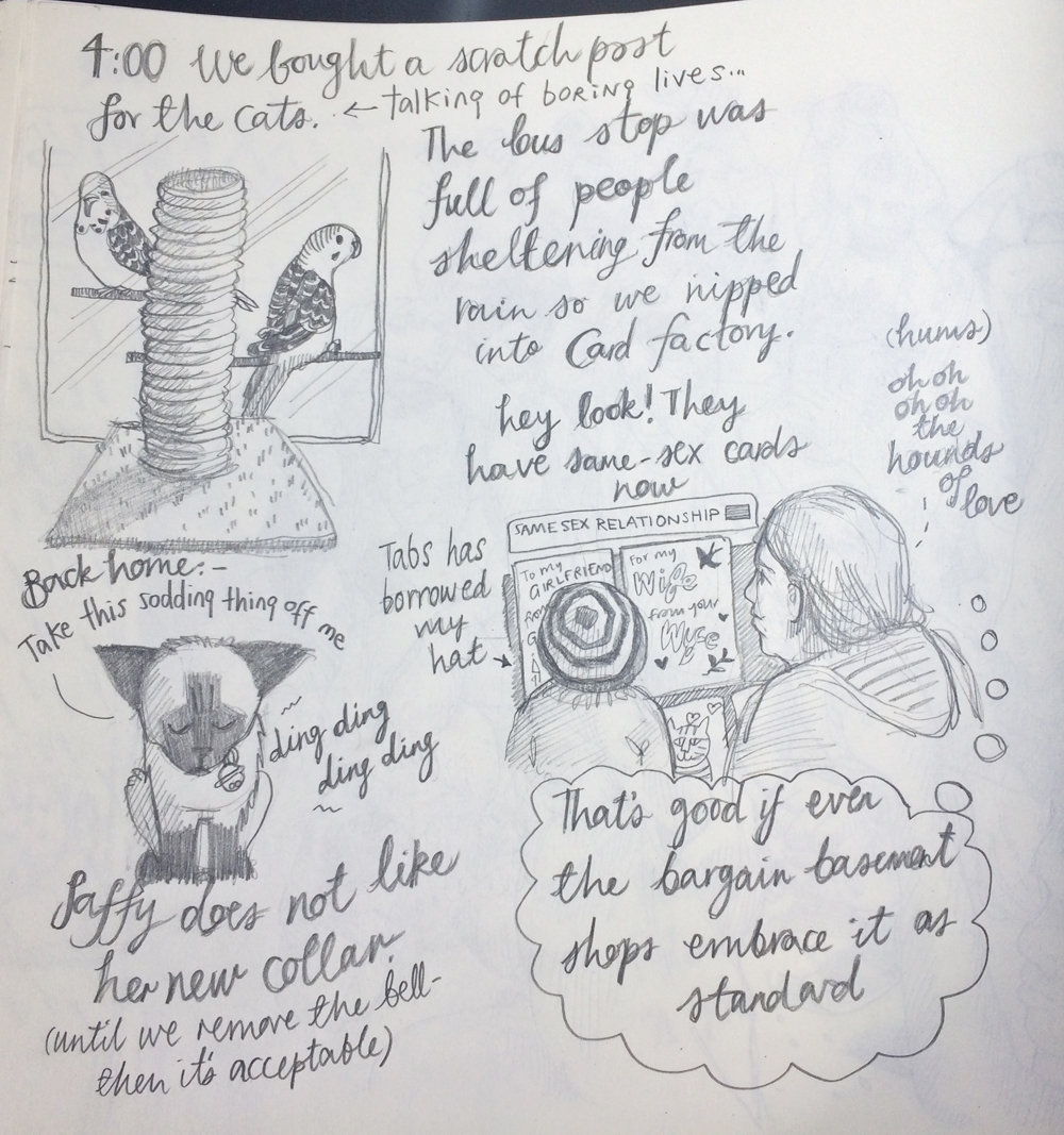 4:00 We bought a scratch post for the cats. Talking of boring lives…The bus stop was full of people sheltering from the rain so we nipped into Card Factory. Hey look! They have same-sex cards now. That’s good if even the bargain basement shops embrace it as standard. (hums) Oh oh oh oh the hounds of love… Tabs has borrowed my hat.
