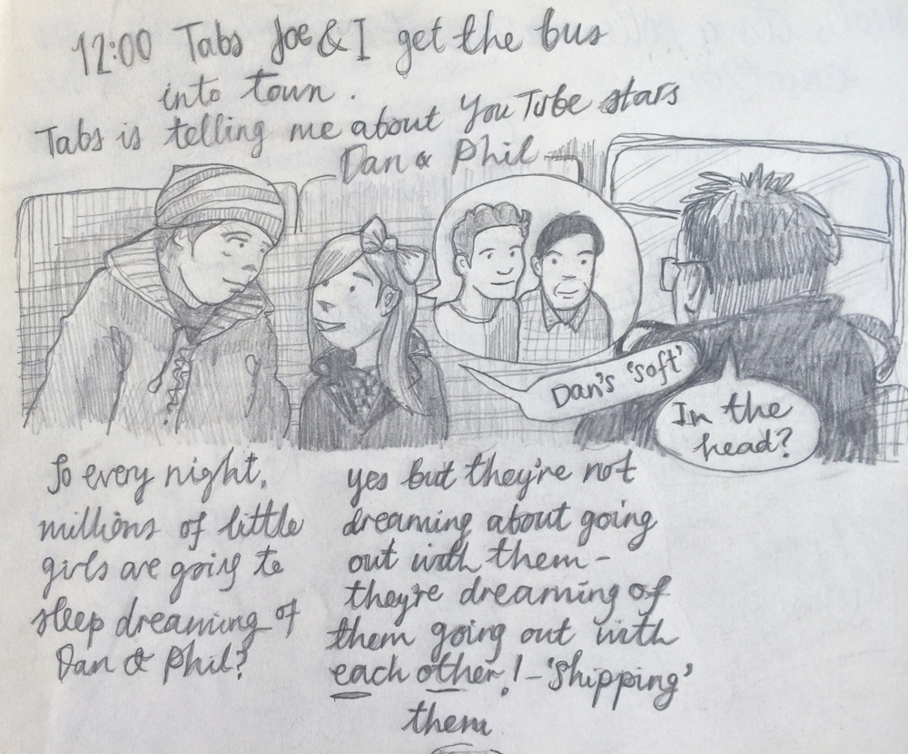 12:00 Tabs, Joe and I get the bus into town. Tabs is telling me about YouTube stars Dan and Phil. So, every night, millions of little girls are going to sleep dreaming of Dan and Phil? Yes but they’re not dreaming about going out with them – they’re dreaming of them going out with each other! ‘Shipping’ them.