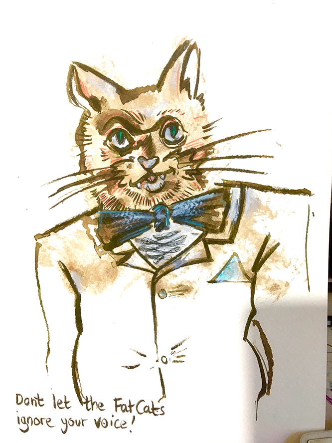 At 2.30- 3.30 on the Sunday, come and get a fat cat drawn by Simon Russell – you make an ink blot and Simon will do the rest!