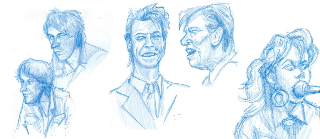 Live Aid – attempts to pin down Bob Geldof and David Bowie’s distinctive looks – plus a backing singer.