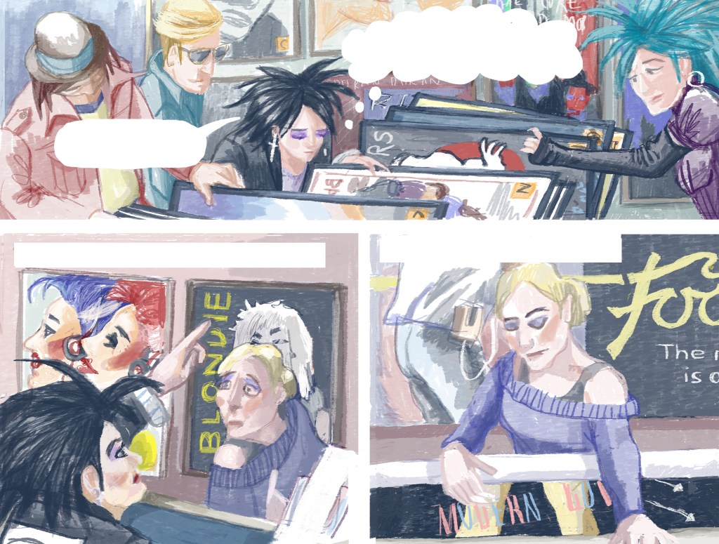 Satin and Tat is set in two time periods: 1984/5, and what was ‘now’ when I began drawing it, but which is fast becoming recent history itself! I’m fond of speaking explicitly about how much fun it is to explore the clothes, hair, makeup and music of the times, but there are other ways in which it records history less explicitly, too.