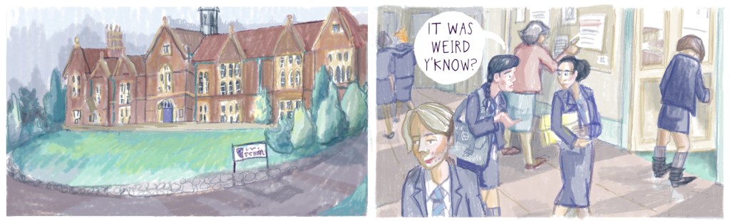 Still, it’s just one page and when I’ve got through this I can move back onto the scenes featuring Alex, thrilling and slightly-older punk rocker, and much more fun to draw than a bunch of girls in school uniforms.