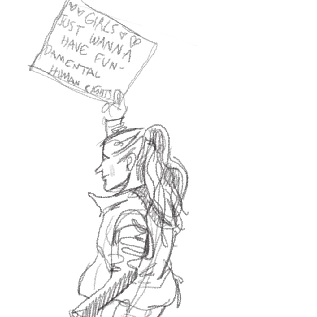 Now my plan is to draw another 19 placards to bring the number up to 50 and offer some pictures I haven’t already shared (there sure are plenty more meaningful and/or witty slogans in my collection to choose from), add some extra content around protest, and get it printed up as a low-cost pamphlet/zine.